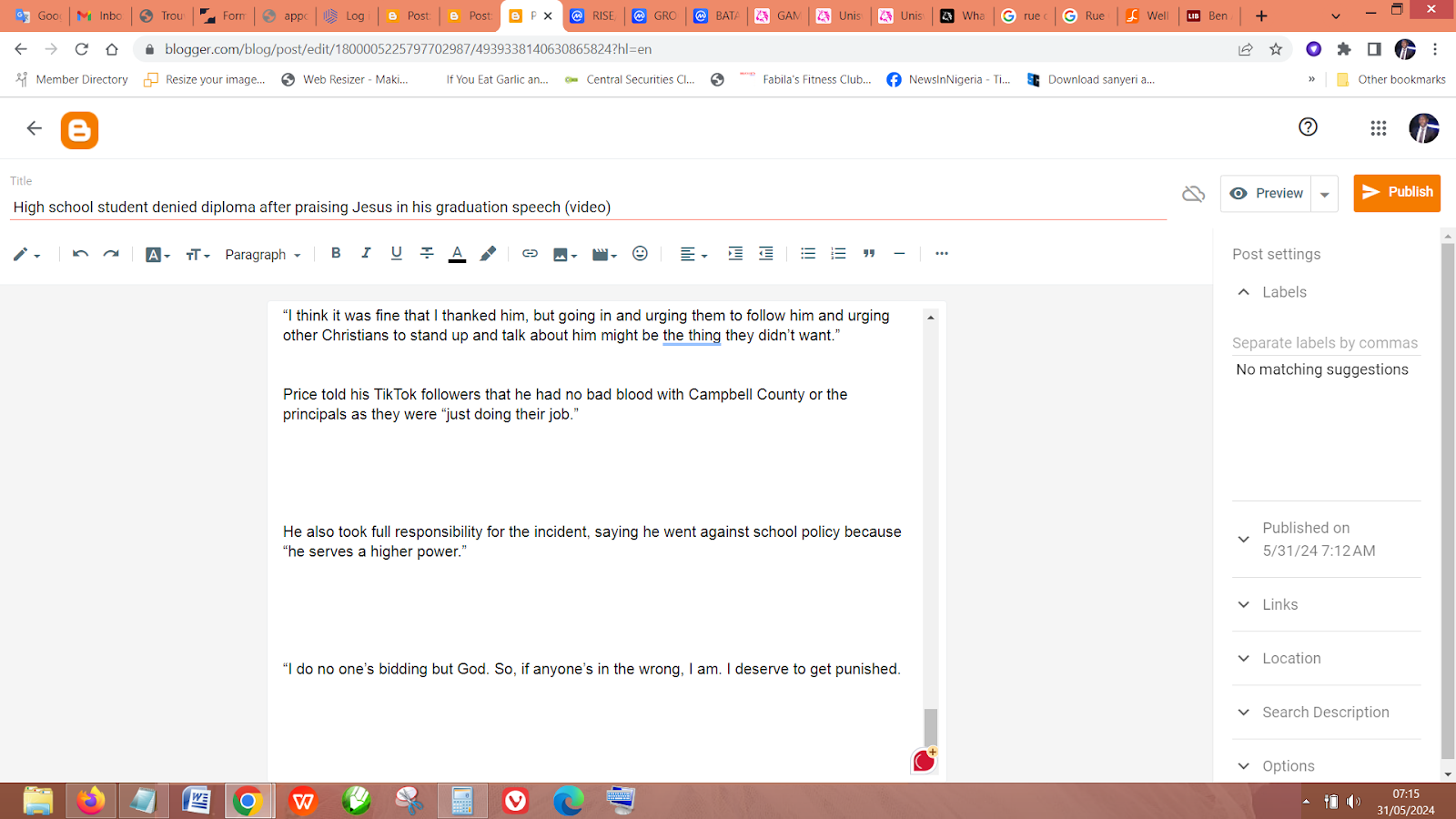 He also took full responsibility for the incident, saying he went against school policy because “he serves a higher power.”